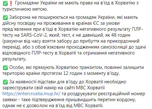 Другие условия въезда граждан Украины в Хорватию в период действия ограничительных мер остаются без изменений.