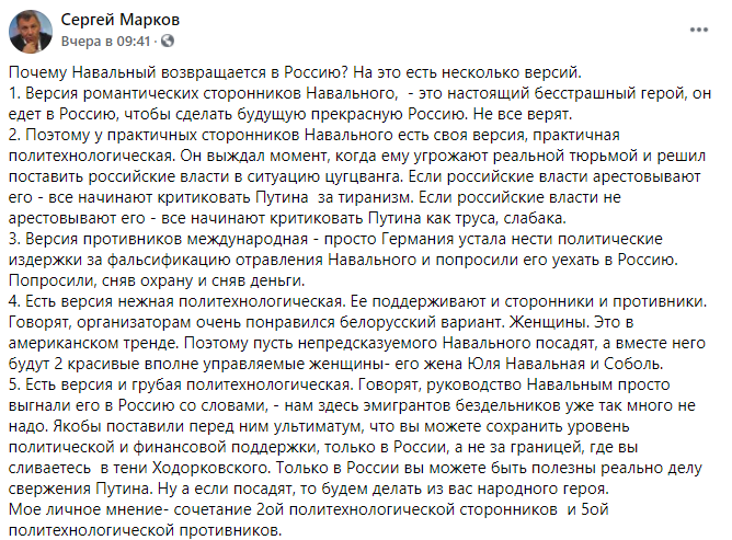 17:00  Российский политолог Сергей Марков анализирует причины, по которым Навальный возвращается в Россию.