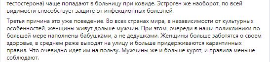 В своем посте в Facebook ученый уточнил, что дело не в гендерной избирательности Covid-19 - от всех остальных простудных заболеваний осложнений у мужчин также больше. Да и в целом в природе у абсолютного большинства млекопитающих, самцы болеют больше и живут соответственно меньше.
