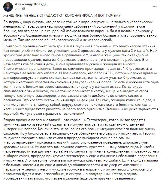 Третья причина это уже поведение. Во всех странах мира, в независимости от культурных особенностей, женщины живут дольше мужчин. При этом, очереди в наши поликлиники по большей мере наполнены бабушками, а не дедушками. Женщины больше заботятся о своем здоровье, в среднем реже выходят на улицу и больше придерживаются карантинных правил. Что очевидно идет им на пользу. Мужчины же и больше курят, и правила меньше соблюдают" - написал Александр Коляда.