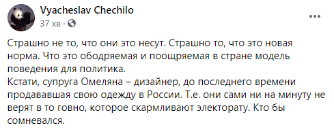 "Страшно не то, что они это несут. Страшно то, что это новая норма. Что это ободряемая и поощряемая в стране модель поведения для политика. Кстати, супруга Омеляна - дизайнер, до последнего времени продававшая свою одежду в России. Т.е. они сами ни на минуту не верят в то г@вно, которое скармливают электорату. Кто бы сомневался", - написал Чечило.