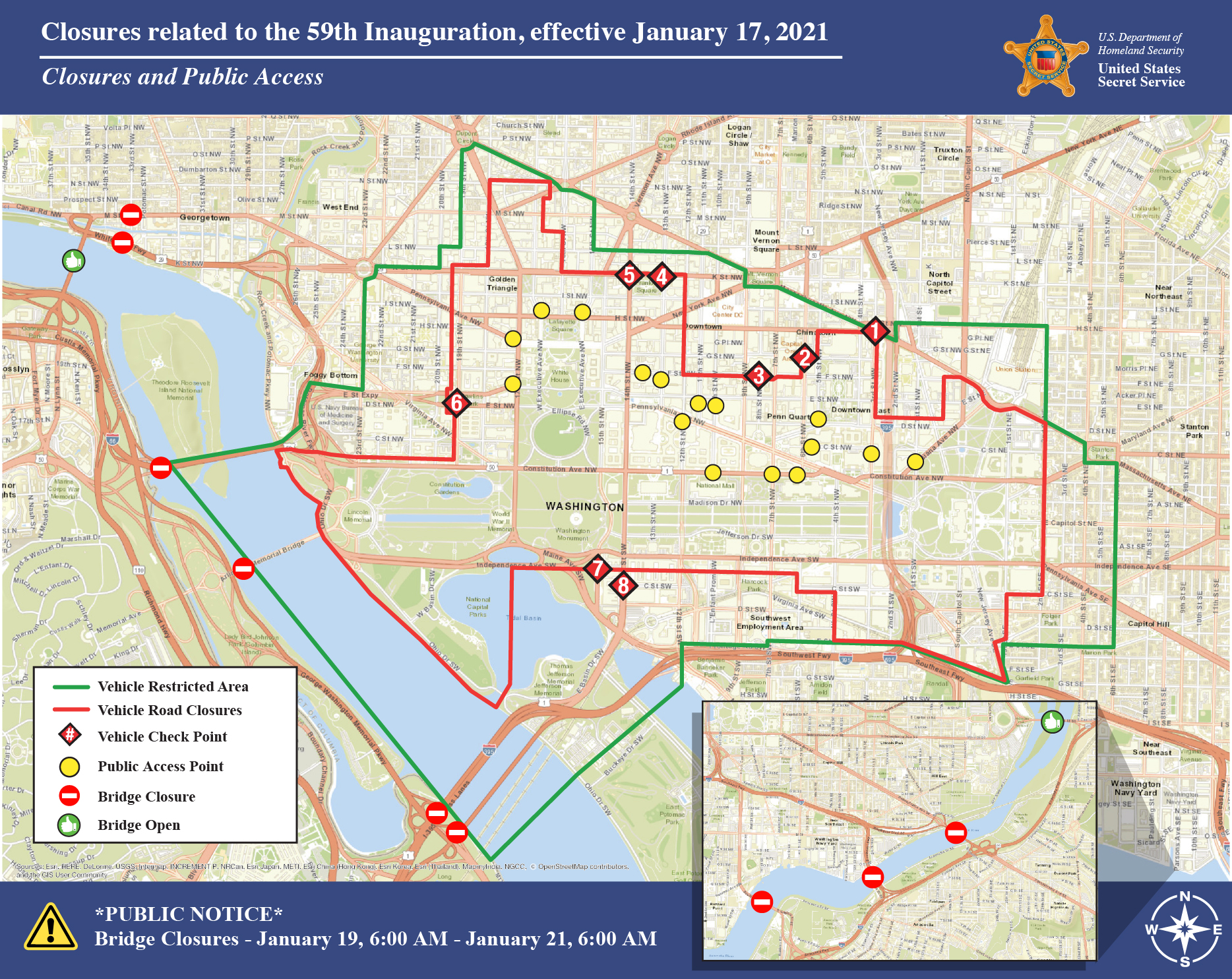 Служба безопасности Белого дома уже опубликовала карту улиц, которые будут перекрыты в столице США не только для автомобилей, но и для велосипедов, а также пешеходов. Перекрыты все мосты.