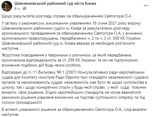В заявлении сказано, что в Украине за жестокое обращение с животными предусмотрена уголовная ответственность по ст. 299 Уголовного кодекса (УК). Тем не менее в ситуации со Святогором есть некоторые нюансы.