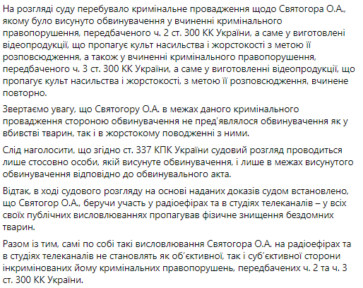 По данным суда, Алексей Святогор, которого обвиняли в распространении материалов, пропагандирующих культ насилия и жестокости относительно бездомных собак, был оправдан, так как следствие не смогло доказать его причастность в совершении правонарушения, предусмотренного статьей 300 Уголовного кодекса.