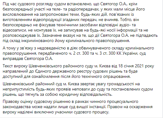 "То есть, он непосредственно не фиксировал техническими средствами соответствующие аудио- и видеозаписи, не монтировал их, не записывал какие-либо носители и не распространял их. Это указывает на то, что действия Святогора не подпадают под состав инкриминированного ему криминального производства", - рассказали в суде.