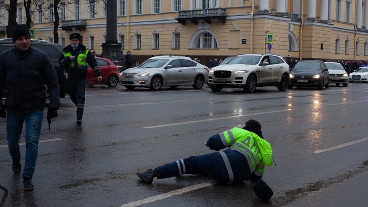 Около 14:30 петербуржец прорвался за ограждения во время несанкционированной акции и ударил сотрудника ДПС кулаком в лицо. От удара правоохранитель упал на землю и потерял шапку. Спустя некоторое время коллега пострадавшего настиг агрессора.