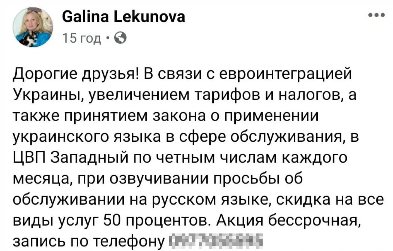 "В связи с евроинтеграцией Украины, увеличением тарифов и налогов, а также принятием закона о применении украинского языка в сфере обслуживания, в ЦВП Западный по четным числам каждого месяца, при озвучивании просьбы об обслуживании на русском языке, скидка на все виды услуг 50%", — написала владелица ветклиники Галина Лекунова на своей странице в Фейсбуке (сейчас пост недоступен).