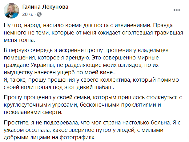 Впрочем, женщина заявила, что не собирается говорить слова, к которым ее вынуждала "оголтевшая травившая ее толпа". Она извинилась перед владельцами помещения, которое арендует, перед коллективом, который "попал под этот дикий шабаш", а также перед своей семьей.