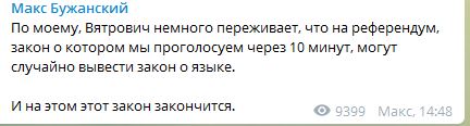 "По моему, Вятрович немного переживает, что на референдум, закон о котором мы проголосуем через 10 минут, могут случайно вывести закон о языке. И на этом этот закон закончится" - написал нардеп от "Слуги народа" Максим Бужанский.