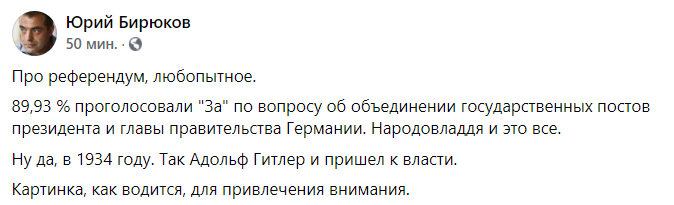 А бывший советник Порошенко Юрий Бирюков счел нужным напомнить, что Гитлер тоже использовал референдумы, чтобы укрепить свою власть. Видимо, поэтому, намекает он, спрашивать народ ни о чем вообще не стоит.