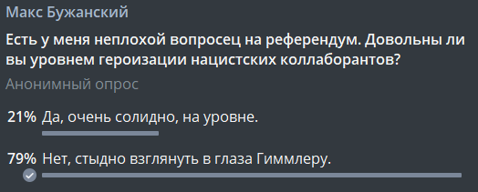 Он также предложил у себя в Телеграм-канале шутливый вариант вопроса для референдума: "Довольны ли вы уровнем героизации нацистских коллаборантов?"