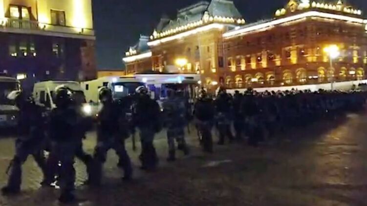 Сотни силовиков прибыли на Манежную площадь в Москве, где планировали собраться сторонники Навального. Скриншот с видео