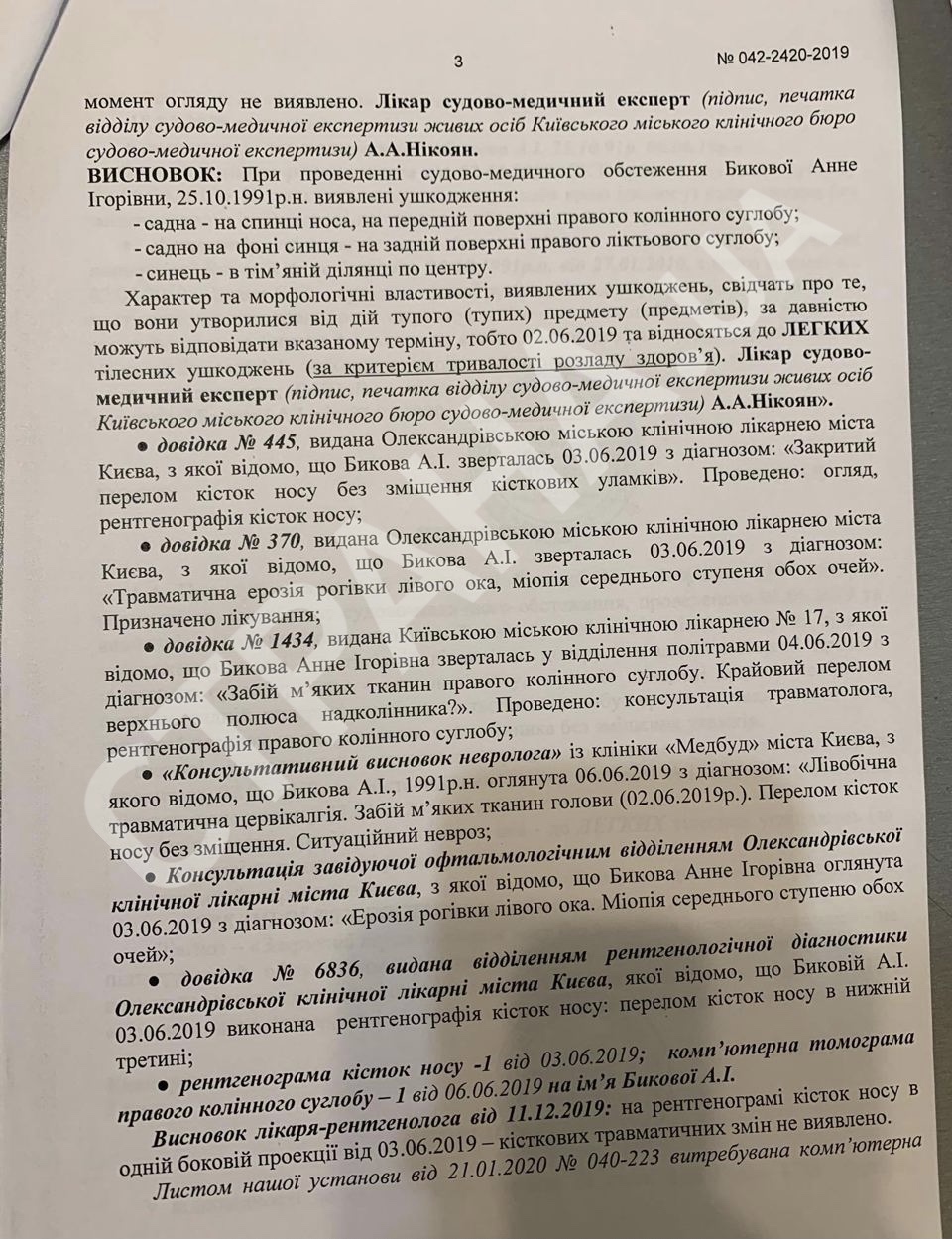 Медицинское заключение о травмах средней тяжести, которые получила Анне Быкова