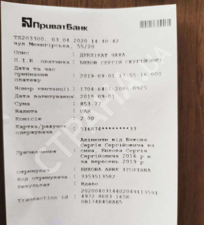 Она добавила, что Сергей Быков отказался от ребенка в декабре 2018 года - через два месяца после того, как супруги разъехались. После этого он высылал на карточку Анне ежемесячно фиксированную сумму - 849 грн 50 коп. Что составляет 1/2 прожиточного минимума на ребенка.