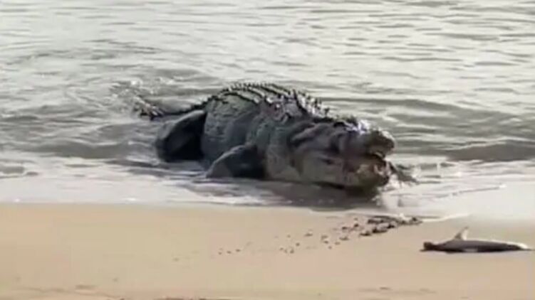 В воскресенье, 7 февраля, в австралийском штате Квинсленд огромный крокодил напугал девушку, которая рыбачила с мужем на берегу океана. Он вылез из воды и съел двух небольших пойманных ими акул.