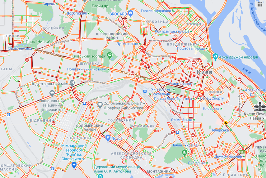 Периодически пробки наблюдаются на Валерия Лобановского, Надднепрянском шоссе, бульваре Дружбы народов, проспекте Воздухофлотском и Подоле.