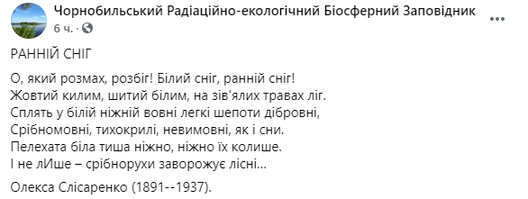 В частности, работники заповедника добавили к фотоснимку заснеженного заповедника строки из стихотворения "Ранний снег" украинского поэта и писателя Олекса Слисаренко.
