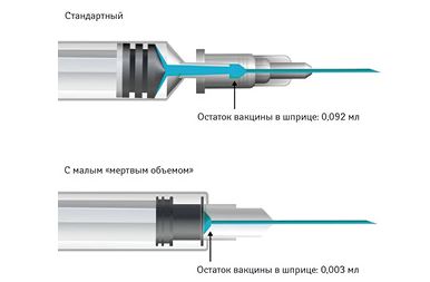 При этом выяснилось, что использовать максимальный объем вакцины можно, используя только специальные шприцы с так называемым малым "мертвым объемом". То есть в них остается меньшее количество не введенного препарата.