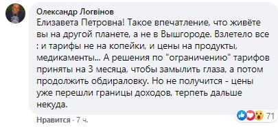"Елизавета Петровна! Такое впечатление, что живёте вы на другой планете, а не в Вышгороде. Взлетело все : и тарифы не на копейки, и цены на продукты, медикаменты... А решения по "ограничению" тарифов приняты на 3 месяца, чтобы замылить глаза, а потом продолжить обдираловку. Но не получится - цены уже перешли границы доходов, терпеть дальше некуда".