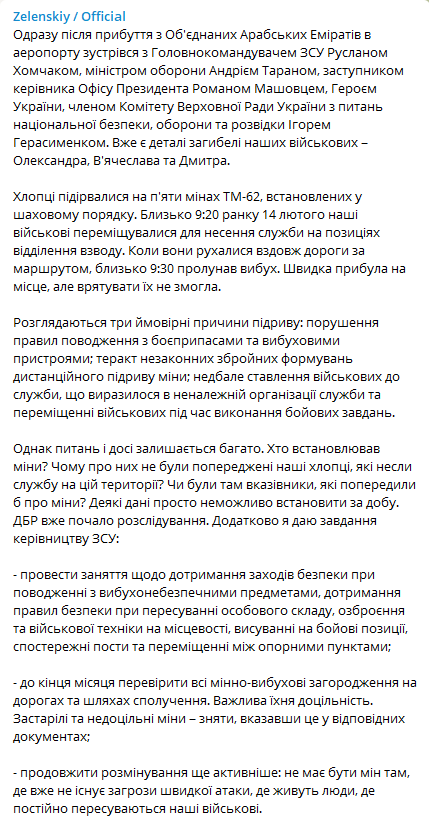 "Ребята подорвались на пяти минах ТМ-62, установленных в шахматном порядке. Около 09:20 14 февраля наши военные перемещались для несения службы на позициях отделения взвода. Когда они двигались вдоль дороги по маршруту, около 09:30 прогремел взрыв. "Скорая" прибыла на место, но спасти их не смогла.