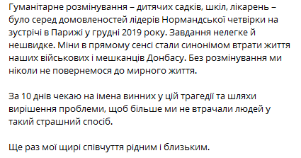 Через 10 дней жду имена виновных в этой трагедии и пути решения проблемы, чтобы больше мы не теряли людей таким страшным образом. Еще раз мои искренние соболезнования родным и близким", - написал Зеленский.