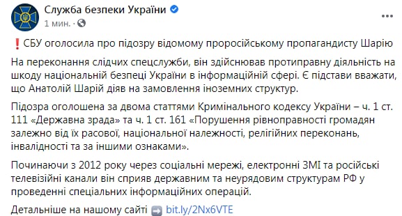 Шарий уже отреагировал на произошедшее: "Благодарю СБУ за предъявление подозрения путем публикации пропагандистского ролика в телеграм по статье "Государственная измена". Теперь мне не надо лишний раз доказывать в ЕС, что все дела на меня - чистая политика", - написал он в соцсети.