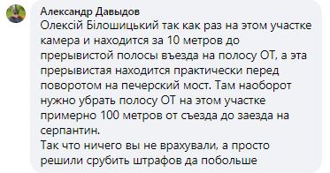 "Так как раз на этом участке камера и находится за 10 метров до прерывистой полосы въезда на полосу ОТ, а эта прерывистая находится практически перед поворотом на Печерский мост. Там, наоборот, нужно убрать полосу ОТ на этом участке примерно 100 метров от съезда до заезда на серпантин. Так что ничего вы не врахували, а просто решили срубить штрафов, да побольше".