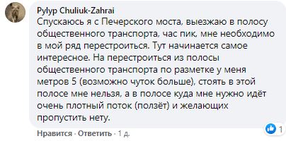 "Спускаюсь я с Печерского моста, выезжаю в полосу общественного транспорта, час пик, мне необходимо в мой ряд перестроиться. Тут начинается самое интересное. На перестроиться из полосы общественного транспорта по разметке у меня метров 5 (возможно чуток больше), стоять в этой полосе мне нельзя, а в полосе, куда мне нужно, идёт очень плотный поток (ползёт) и желающих пропустить нету".