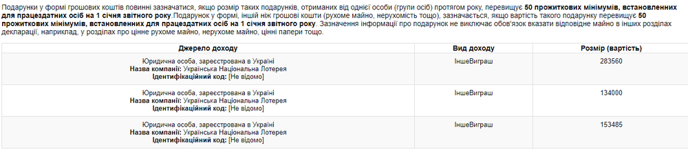 Он указал в декларации три "победных транша": 283 560, 134 000 и 153 485 грн в Украинской национальной лотерее.