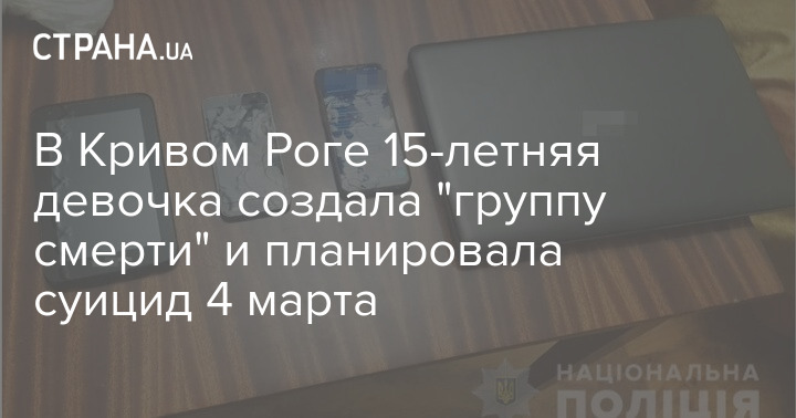 Полиция Днепропетровской области предупредила попытку суицида 15-летней девочки, которая сама создала так называемую группу смерти, администрировала ее и планировала совершить самоубийство 4 марта. Инцидент произошел в Кривом Роге. Об этом сообщается на сайте региональной ГУНП.