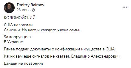 "Формально Коломойский попал под санкции за работу в качестве главы Днепропетровской области в 2014-2015. Это очень смешно, если вспомнить, что во многом именно благодаря его усилиям зона влияния США в Украине сейчас куда больше, чем она могла бы быть" - написал журналист Вячеслав Чечило.