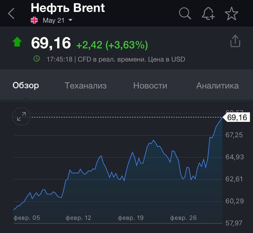 По данным на 16:45 по Киеву, фьючерсы на нефть марки Brent с поставкой в мае выросли на 3,63% - до $69,16 за баррель. В прошлый раз цена Brent превышала данную отметку в январе 2020 года.