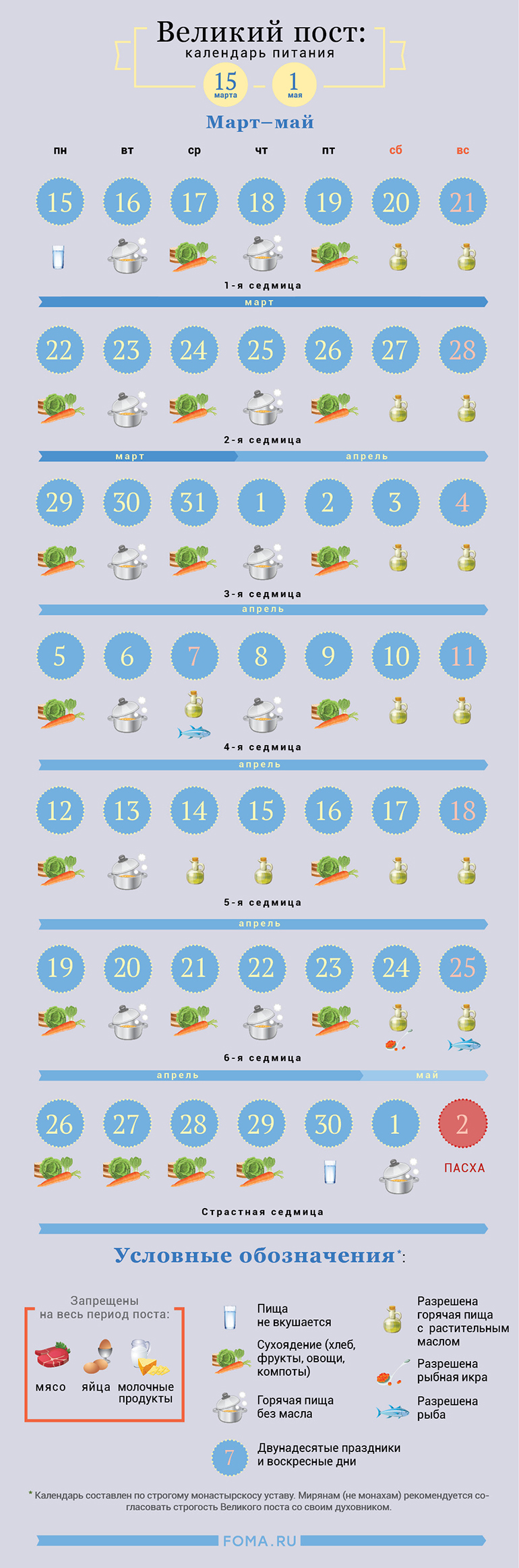 Сегодня первый день семинедельного Великого поста перед Пасхой. Он продлится до 1 мая, а 2 мая православные будут отмечать Светлое Христово Воскресенье. Пост накануне Пасхи - самый строгий в церковном календаре, когда из рациона полностью исключают мясо, молоко, яйца, алкоголь, рыбу. Кроме того, среди недели есть дни, когда нельзя есть горячую пищу и растительное масло. По такому принципу постятся монахи.