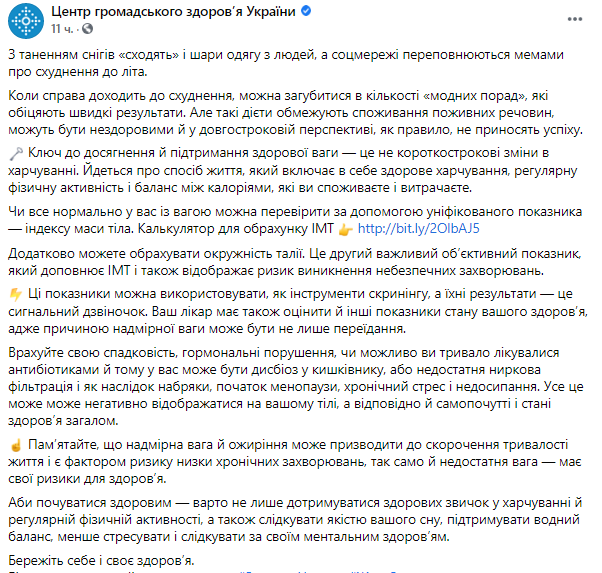 "Чтобы чувствовать себя здоровым - стоит не только соблюдать здоровых привычек в питании и регулярной физической активности, а также следить качеством вашего сна, поддерживать водный баланс, меньше стресуваты и следить за своим ментальным здоровьем", - добавили в ЦОЗ.