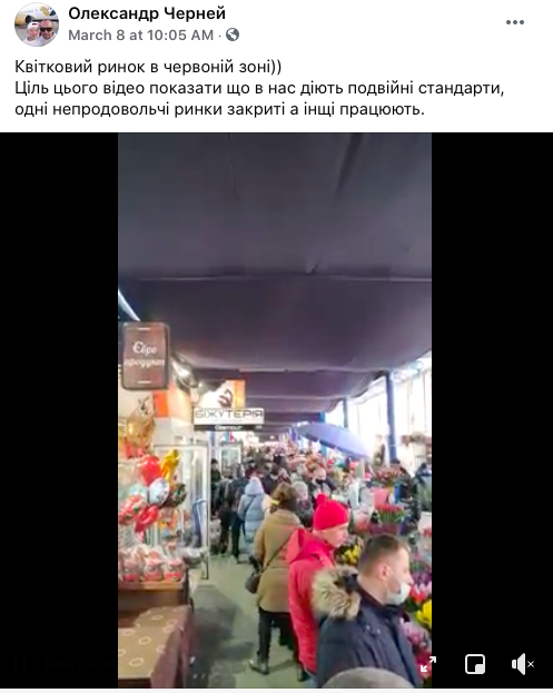 "Цветочный рынок в красной зоне)) Цель этого видео показать, что у нас действуют двойные стандарты - одни непродовольственные рынки закрыты, а другие работают", - написал Черней.