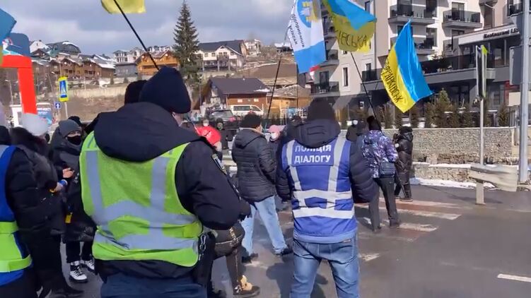 Участники митинга проводят предварительное блокирования курорта, на котором зимой отдыхал президент, беспрерывно двигаясь по пешеходному переходу на въезде. Так они они блокируют движение транспорта. По словам представительницы движения "SaveФОП - Прикарпатье" Людмилы Климчук, среди участников митинга представители среднего бизнеса из Ивано-Франковска, Калуша, Долины и Коломыи.