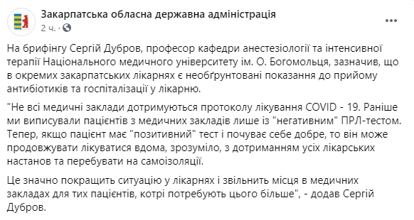 Сергей Дубров заявил об отступлениях от протокола в лечении коронавирусных больных на Закарпатье. Фото: facebook.com/odazakarpattya