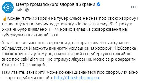 Отмечается, что только в феврале этого в Украине было выявлено 1174 новых случаев заболевания туберкулезом в активной фазе.