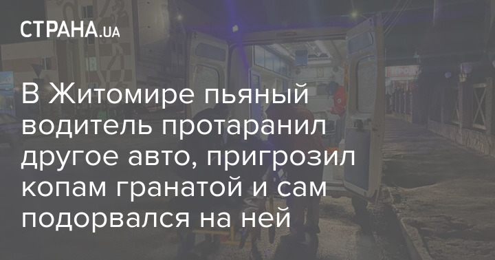 В Житомире пьяный водитель, который пытался сбежать от полиции и протаранил другой автомобиль, угрожал правоохранителям гранатой, но в результате сам подорвался на ней. Инцидент произошел в ночь на понедельник, 22 марта, сообщается на сайте регионального ГУНП.