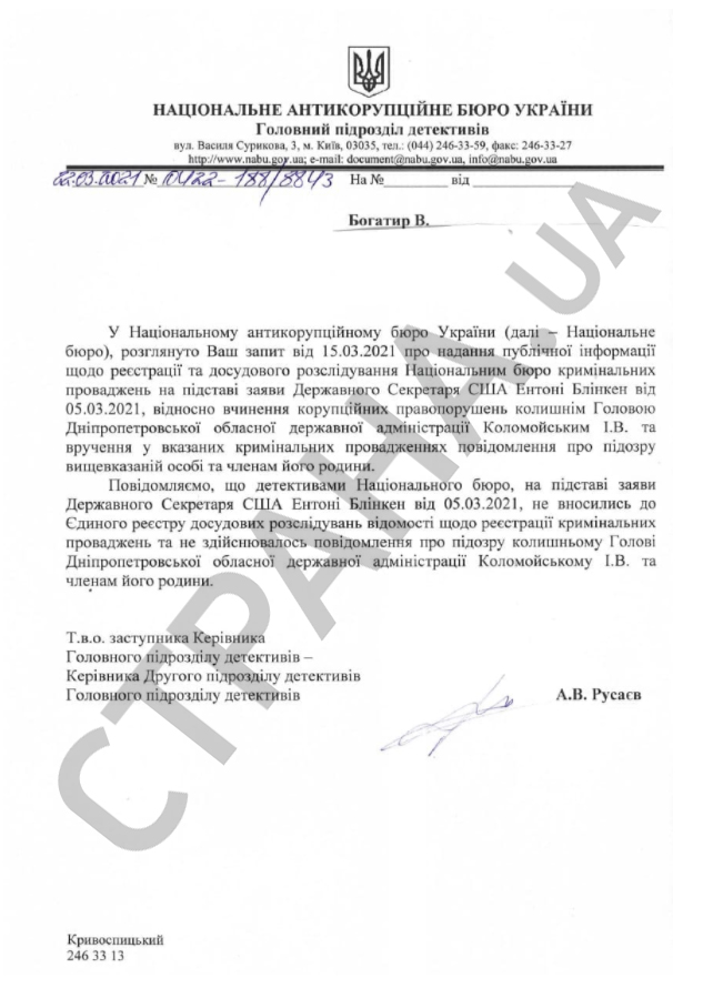 "Сообщаем, что детективами Национального бюро на основании заявления государственного секретаря США Энтони Блинкена от 05.03.2021 не вносились в Единый реестр досудебных расследований сведения о регистрации уголовных производств и не осуществлялось сообщение о подозрении бывшему председателю Днепропетровской областной государственной администрации Коломойскому И.В. и членам его семьи", - сказано в ответе НАБУ.