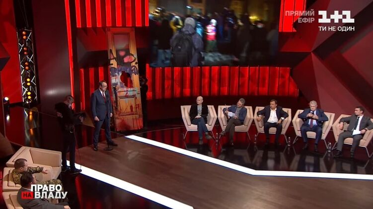 В эфире программы "Право на власть", на которой обсуждали погром на Банковой 20 марта, принесли обрисованную дверь из Офиса президента.