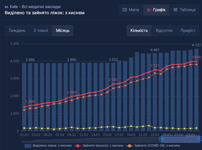 По данным на сайте СНБО, с начала марта наблюдается постоянный рост этого показателя. Если 1 марта было занято чуть более тысячи ковид-коек, 29 марта - почти четыре тысячи (3998 из 4727). То есть рост госпитализаций - в четыре раза.