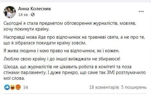 31 марта в своем фейсбуке нардеп подтвердила факт переписки, но уточнила, что имела ввиду уезжать "не навсегда".