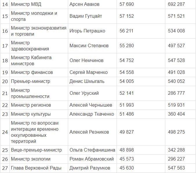 Рейтинг возглавляют силовики и правоохранители, затем министры. Меньше всего зарплата в аппарате Верховной Рады и Офисе президента. Одна из самых скромных зарплат у президента, который получает в месяц тысячу долларов, и главы его Офиса.