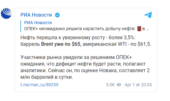 В четверг, 1 апреля, на торгах цена на нефть довольно неожиданно перешла к уверенному росту - более 3,5%: баррель Brent уже по $65, а американская WTI - по $61,5. Об этом сообщает РИА Новости.