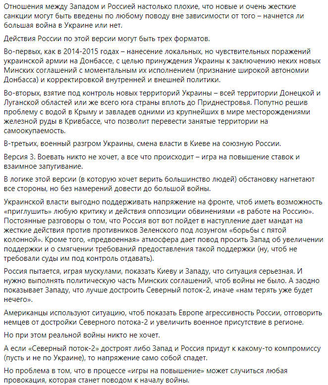 Если же война будет победной для Украины - ещё лучше: в результате ликвидации ДНР и ЛНР России будет нанесён колоссальный имиджевый удар в глазах своего же населения. А осенью как раз выборы в Думу, а тут ещё история с Навальным... Интересные, короче говоря, возможности открываются!