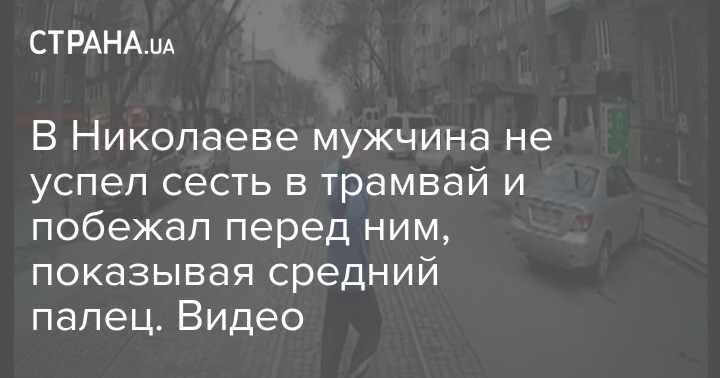 В Николаеве мужчина не успел сесть в трамвай и побежал перед ним, показывая средний палец. Видео