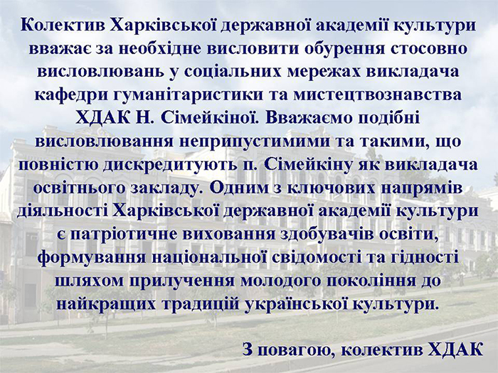 "Академия культуры не имеет отношения к подобным высказываниям. На сегодня этим вопросом занимается СБУ. Мы проведем разъяснительную работу с работниками заведения, чтобы избежать таких ситуаций в будущем", - прокомментировал первый проректор ХГАК Юрий Лошков.