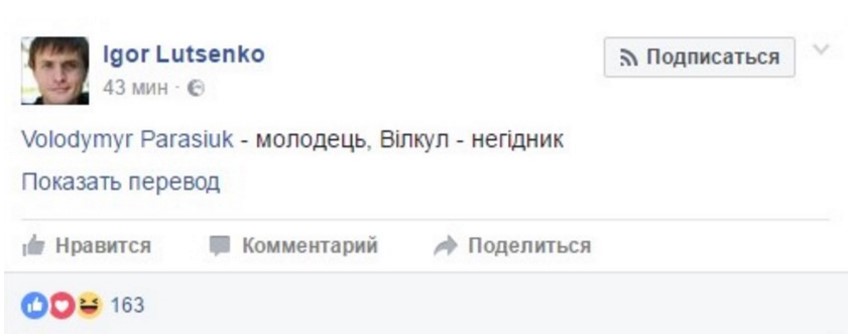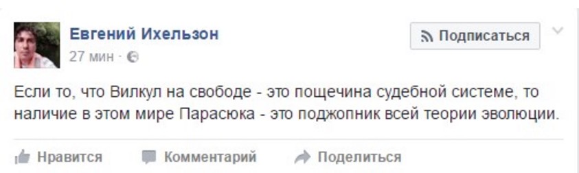 "Если то, что Вилкул на свободе - это пощечина судебной системе, то наличие в этом мире Парасюка - это поджопник всей теории эволюции", - написал Евгений Ихельзон, который, судя по всему, Вилкулу не симпатизирует, но и поведение Парасюка осуждает.