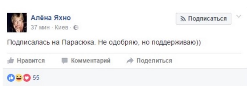 "Подписалась на Парасюка. Не одобряю, но поддерживаю))", - пишет в Facebook журналист Алёна Яхно.